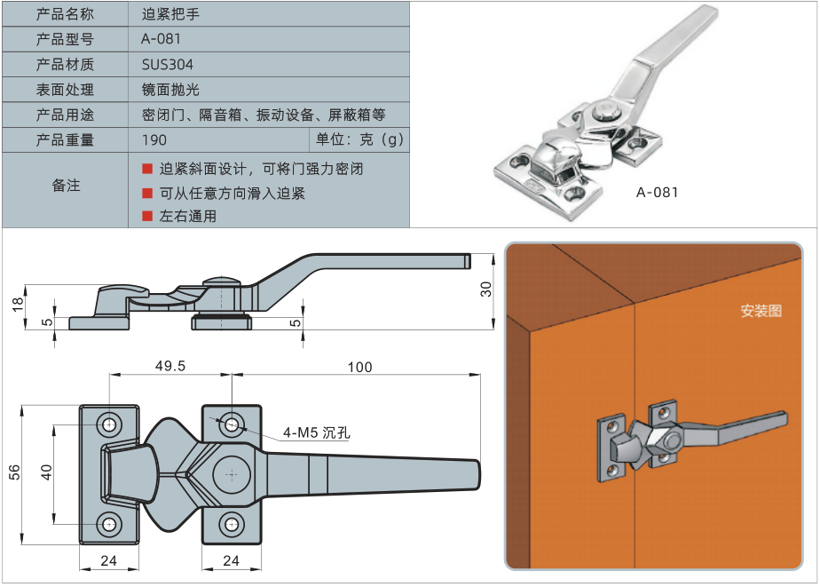 1、迫紧斜面设计,可将门强力密闭